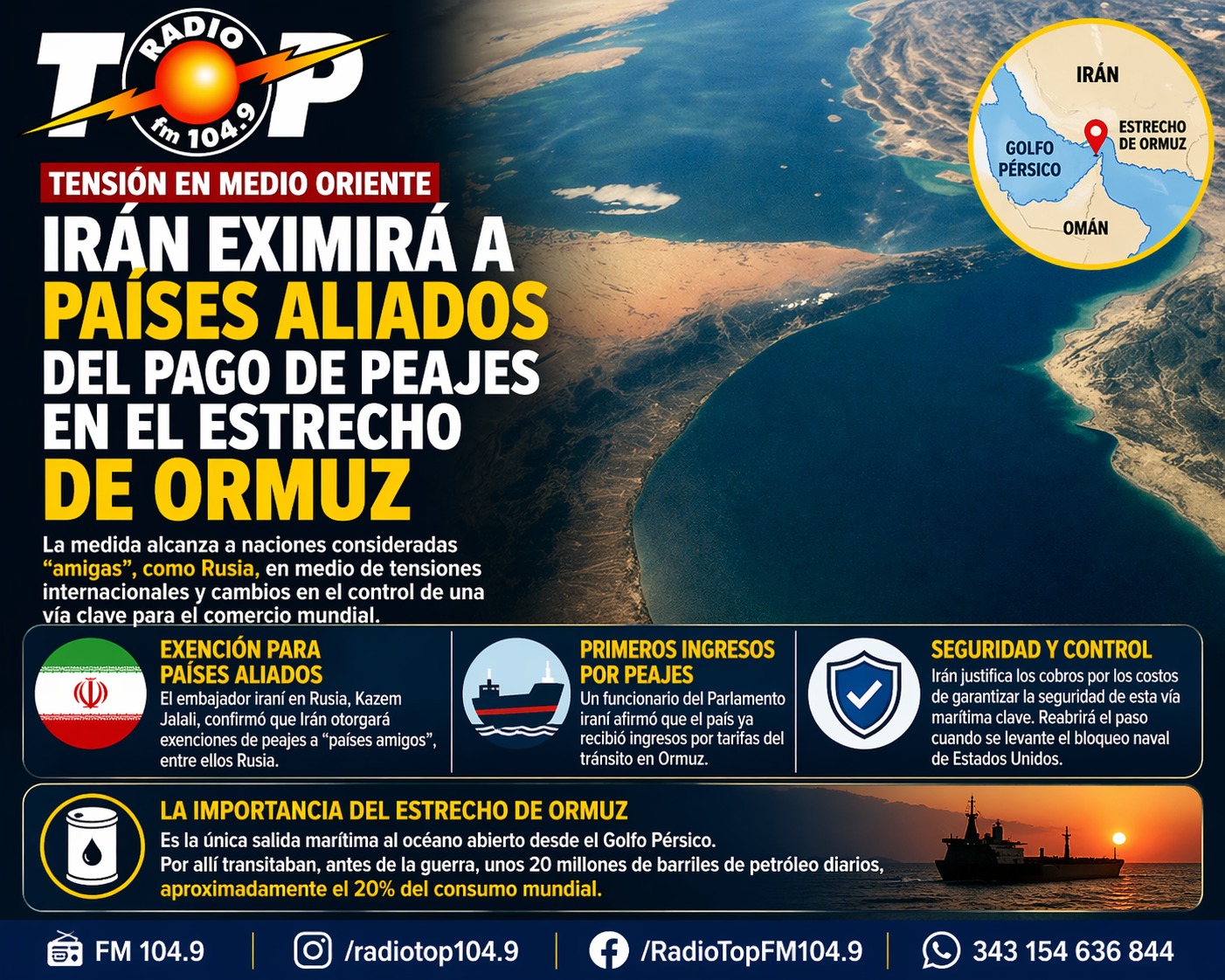 Irán eximirá a países aliados del pago de peajes en el estrecho de Ormuz